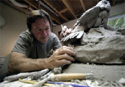 PAUL BRUNELLE (1954- ) born in Ontario, Canada, has been fascinated with art since he completed his first oil painting at age twelve. He has continued painting and drawing and began to sculpt in 1985. Paul describes clay as having essential qualities needed to create his art. In its pliable state, clay can be quickly sketched to capture attitudes and expressions, as well as designs and compositions. The clay can then be allowed to dry to the point when you can carve the surface detail of feathers and a variety of textures. The sculpture is then dried and kiln fired to the permanence of stone. After firing, the sculptures are painted with oils (for the birds) and acrylics (on the branches and other settings).