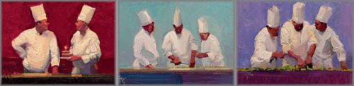 I’m interested in the light and shadows created by the working chefs, and it allows me to add a storyline to the scene. In addition, restaurants conjure up good times. - KA
