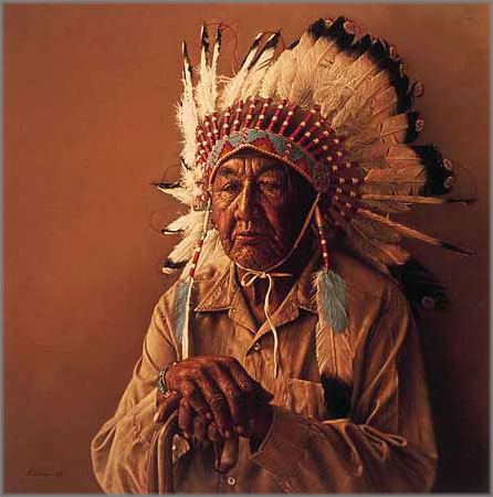 The storyteller played an important part in Arapaho culture. It was his function to pass down the lore and legends of the tribe from one generation to the next. As there were no written legends, this was the only way stories lived on. Mike Brown was a storyteller. A full-blooded Arapaho, Mike converted to Catholicism (hence his Christian name) and lived at the St. Stephen's Catholic Mission for Arapaho on the Wind River Reservation in Wyoming. At the time of this painting, he was in his early eighties. - JB