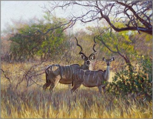 The greater kudu is arguably the most handsome antelope in Africa. With the male’s spiral horns often reaching two and a half twists and a length of nearly 70 inches, their beauty and grace is beyond compare. Their horns have been used by indigenous people as musical instruments, honey containers, symbolic objects used in rituals and as a symbol of male potency. Like all spiral-horned antelope, they posses small white patches on their face and neck which supports the legend that when God made them, he held their faces to admire their exquisite beauty, and when he let go, his finger prints left the white marks. - JB