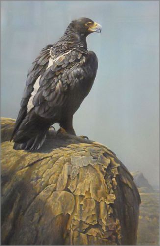 This scene is based on a memorable experience early one morning in Africa. We visited a granite outcrop, which was the home of a pair of black eagles. As the sun warmed their perches on the higher rocks, upward air currents were generated. Soon the eagles took off, riding the thermals. They gave us a wonderful display of flying skills as they hunted for prey. - RB