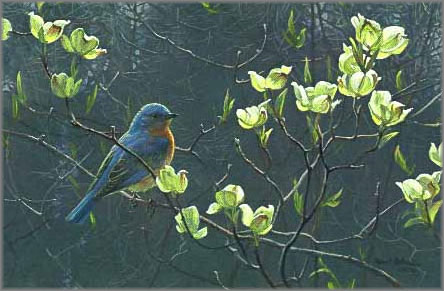 In the early spring, you can look through the forest and see the blossoms of the dogwood like glowing beacons or candles, particularly when the sun shines through and they are backlit. This is the primary effect I wanted to achieve in this painting. There is a lightness, an airiness and a delicacy to everything, a kind of gentleness. This is why I chose the bluebird for this painting of early spring. It doesn't sit there and sing away defiantly; it has a little, low kind of purring chirp. It is one of the most gentle of all birds. - RB