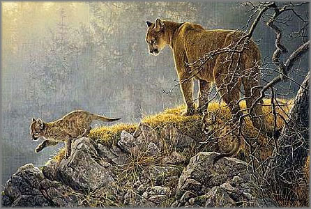 It is late afternoon, and the sun is glowing through the tops of the Douglas firs. It is time for the mother cougar and her kits to venture out for the evening hunt. This particular scene shows an ecosystem with which I am very familiar. In fact, it surrounds our home. On the southwestern mountain slopes, which pick up the afternoon sun, one finds the Garry oak savannah and open parkland with grasses and wildflowers under the trees. In the valleys and northeastern slopes grow the Douglas fir, cedar and hemlock spruce. This blend is just right for the cougar family, providing shelter and cover for rest, plus open areas affording good vantage points. It is also a perfect place for cougar kits to play. - RB