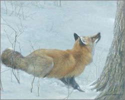 Although I don't consider myself an anecdotal painter, this one was too obvious to resist. In most of my paintings I construct a moment in time - a moment that could have happened. I had a number of references of foxes looking up. It was easy to add the tree and to imagine that a squirrel had ventured out across the snow, but made it up the trunk in the nick of time. Anyone who has taken their dog for a walk in the woods has been there in this potential little story. - RB