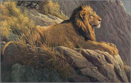 This image is a composite of many of the noble lions I have seen, showing the king in the maturity of his rule. He is a ruler of his pride and ruler of many square miles of hunting territory. His resting place is high in a granite outcrop, a protrusion of ancient Africa which rises above the game-filled plains. - RB