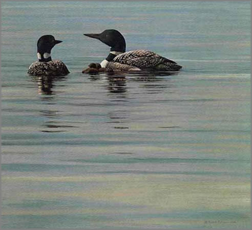 To millions of people, loons symbolize the clean, remote wilderness. It is partly the familiar sight of the elegant silhouette, but mainly the haunting cry. Now, of course, lakes like this one are threatened by acid rain, the fish population is declining as the acidity rises. In time, there will be no food for the loons, and our lake will be dead. Let us hope that powerful forces will come to the rescue in time. - RB