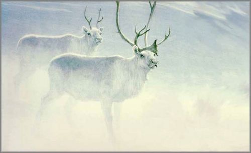 The Peary caribou, the smallest of all caribou, occurs only in the Queen Charlotte Islands of Canada's High Arctic. It is the color of pale pewter, and the small herds of these compact little animals waft across the landscape like ghosts. The northern archipelago is very barren with far more rock than tundra, and so even in open country (and it's all open country) the caribou blend perfectly with the background. Their population have declined by some ninety percent over the last three decades. In addition to living in one of the harshest environments in the world, the species faces further pressures from hunting, non-renewable resource development and contamination of the arctic ecosystem. To me, it is a sin against Creation to render extinct something that is so unique and has taken so long to evolve. I realize that this is happening every day in the tropics, but when there are so few species in the Arctic, it seems even more unforgivable. - RB