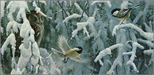 Robert Bateman - Scolding - Chickadees and Screech Owl, The