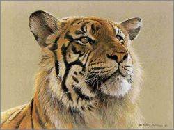 In a sense, this is a picture of grass. The striking vertical yellow and amber stalks with the intermittent shadows are as strong as the tiger's stripes. I wanted to set up a disturbing, electric tension between the shocking green sprig of grass near the center of the picture and the tiger's eyes - the only other green in the picture. - RB