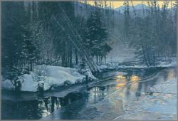 Here I have shown a bull moose about to cross a beaver dam in early winter. The pond has not yet frozen. Besides portraying a mood of time and place, the interesting challenge, for me, was to show the textures and colors of the water, ice and snow. They are all H20, yet their physical properties do different things with light. - RB