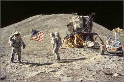 But first, the matter of ceremony. Planting the flag, or perhaps a stick or spear before flags were created, has been a tradition in exploration since ancient times, and moon exploration was no exception. They couldn’t, however, count on the wind blowing the flag since there is no air on the moon. So they used a small metal snap-up curtain rod along the top edge of the flag. - AB