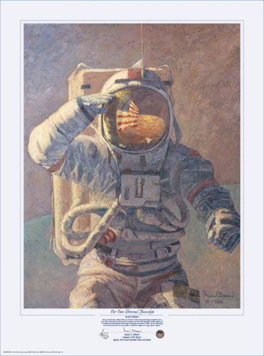 Every human who walked on the moon did so in his own personal spaceship. We called them space suits and they performed beautifully on all six lunar landings. I painted astronaut John Young all bundled up in his. John commented, ‘I can’t speak too highly for the pressure suit. Boy that thing really takes a beating.’