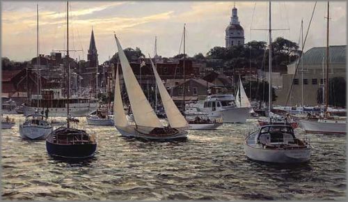 It's late afternoon at Annapolis Harbor and a sailboat, under full sail, heads home through the anchorage. In the background, on the left, is the 19th century Church of St. Anne. On the right is the Maryland State House built in 1772 and still in use by the Maryland legislature.