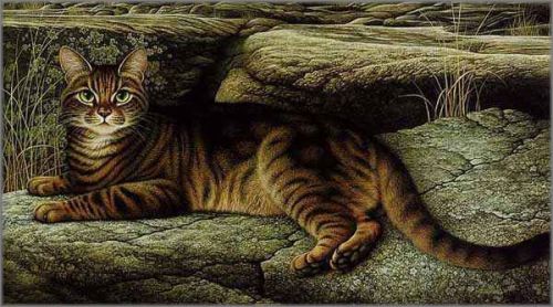 We're talking here about divas. This kitty cat has one big attitude. Reclining on the rocks with a studied pose which says, "Look at me, but don't you dare get too close with that camera," this feline looks like quite the star. Perhaps a star with a very wild life, too. - BB