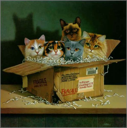 I've always had a chuckle about labeling packages "Fragile". It seems to insult the postal gods, and invites a little revenge. But I like happy endings, and the misadventure in this picture's story turns out okay. Arriving in perfectly crafted condition are a Scottish Fold Calico, a Golden Persian, an American Burmese, a Turkish Van, and a Chartreux. Can you guess the breed of the hidden cat? - BB