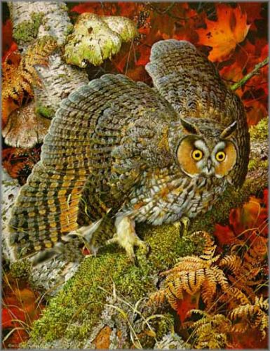 Having a very peaceful nature, I often wonder why I find myself attracted to birds of prey and predators in general. In the case of birds of prey, perhaps it is because of their beautiful eyes - especially the intelligent look of the owls. When threatened, the long-eared owl can change from a very thin silhouette to a voluminous, impressive bird. This surprising behavior often protects him from his enemies, as most would not dare challenge such a large bird. Seeing the owl in this menacing position with his bright yellow eyes, wide open was very impressive and I wanted to capture it. - CB