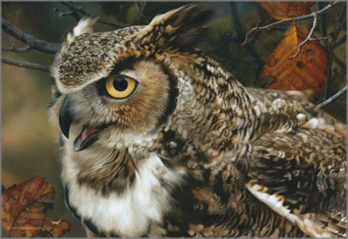 The model for this image was sitting on the hand that painted him (with a leather falconer glove. The closeness of those eyes made an unforgettable impression on me. - CB