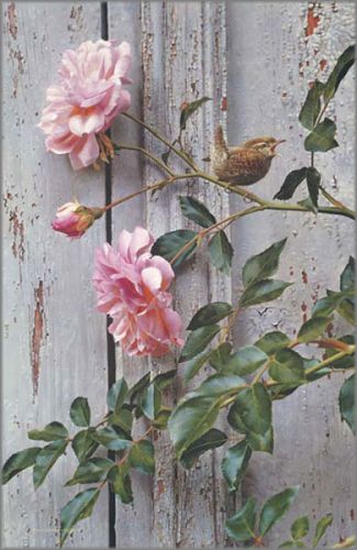 Old properties are always attractive to me because of the big trees and dense vegetation, especially when the property is abandoned. Being around dense vegetation means seeing or hearing the winter wren. On a trip in France, at the entrance of a big abandoned property, I saw a beautiful wild rose garden around an old forester's house. And indeed, a little winter wren was singing out its joy of life! It seemed to like the rose garden as well as I did. For a few brief moments, it posed on one of the roses…the kick of such a moment is enough to inspire a painting. The winter wren, a true American, is the only wren that made it through Alaska into Europe, and it has spread out all over the continent. It is the smallest of the wren family, and an incredible singer. - CB