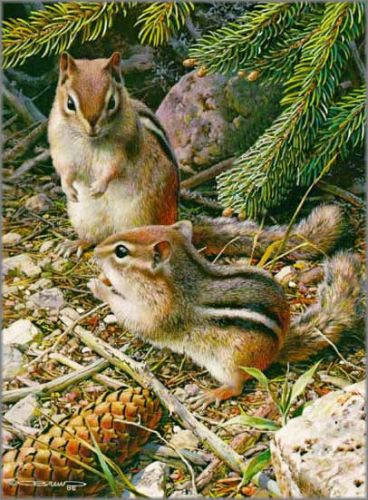 While studying moose, beaver, ducks and herons in the Algonquin Park in Ontario, Canada, an invasion of black flies forced me to stay close to the lodge area which was relatively free of the flies. As a result, I was able to spend hours observing eastern chipmunks, which I was anxious to do as I was already familiar with the western species. It was not difficult to find them once you knew how to spot the location of their burrow entrance. The much lighter colors and different pattern of stripes were obvious differences in the eastern chipmunk. Watching them run under the dark pine trees and then suddenly reappear in the bright light was a delightful scene and it inspired me to do this painting. - CB
