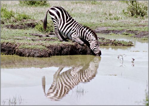 I loved the position of this zebra as it knelt to drink from a water hole in the Maasai Mara. - AB