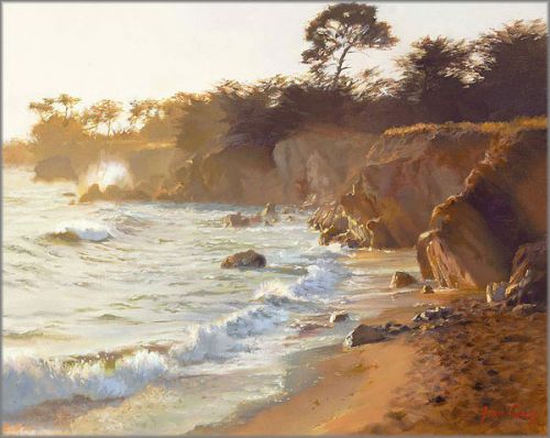 One evening many years ago, the light was perfect as my artist husband and I set out on a photo adventure. I drove into the Sea Ranch entrance and down around the bluffs, where we discovered a path. After running along the bluffs with our cameras, in and out of cypress forests and through blackberry bushes, the path opened into a beautiful cove, drenched in the last hour of golden sun. Because of the many recent storms, there was, in the protection of the cove, a wondrous accumulation of driftwood, knocking back and forth like an orchestra of wood percussion instruments as the waves flowed in and out. We climbed down onto the beach and took hundreds of photos. As each wave came and went, the wood was completely rearranged. I have painted this scene several times over the years. - JC