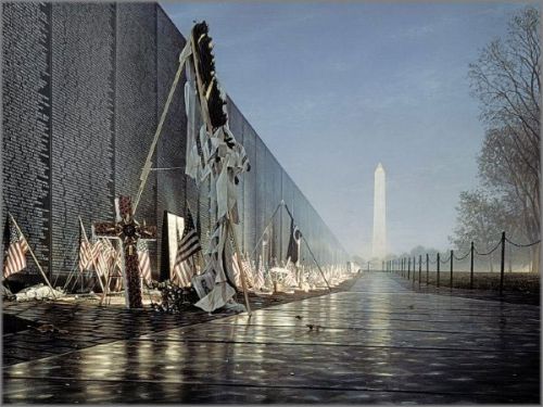 The Vietnam Veterans Memorial Wall contains the names of 58,226 men and women who were killed and remain missing from that war. The names are etched on the black granite panels that compose the Wall, and the panels are arranged into two arms, extending from a central point to form a wide angle. The names are listed in the order in which the men and women died or were declared missing. The first death was recorded in 1959 and the last in 1975. More than 500 individual names are readable in the Chase painting. Line of Duty, the original work, was inspired by the photography of Larry Powell.