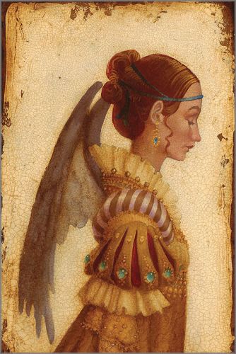 Painting as the “Master,” I imagined myself commissioned to create the work by a patroness from an influential family of Venice. It was customary at the time for the wealthy to request their portraits take on the literal characteristics of angels but may also reflect the Master’s appreciation of Isabella as his muse. - JCC
