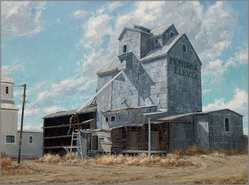 This old grain elevator seemed to reach for the sky and I wanted to convey the strength of this stately structure. While painting it I often thought about the all of the people who once made it a thriving hub of commerce and activity. Now, however, it is so quiet, with only the wind whistling across the metal. In my mind, these aged buildings have unique personalities and this particular one seems to be very strong and proud like the country in which it stands. - CC