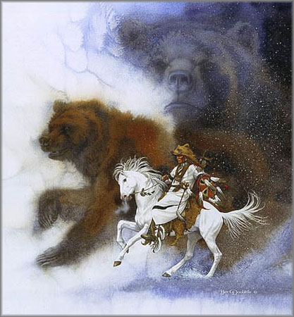 Like many tribes of Indians, the Blackfeet lived in fear of many dangers... uncertainties, such as starvation, sickness and attacks from animal and human enemies. After the buffalo, the grizzly bear was considered to contain great supernatural powers. The bear was revered for his strength, agility, vitality and invulnerability to other animals, bullets and arrows. He was believed to have a great wisdom and the ability to find herbs to heal his wounds. When an Indian received the powers of the grizzly bear, he would then study the animal in great detail and create his own personal medicine bundle of objects instructed to him by his vision spirit. This medicine bundle was an important symbol of his powers. In time, the Indian became like the grizzly and thus became feared and respected by his enemies. "Two Bears of the Blackfeet" is one such Indian. - BD