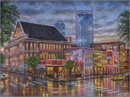 Nashville is the state capital of Tennesee, Well known as "Music City", it is home to Music Row, The Grand Ole Opry, and the Country Music Hall of Fame. Nashville is rich in history and in this painting, Robert has captured downtown at Broadway. The famous Ryman Auditorium, original home to The Grand Ole Opry, sits majestically overlooking the Music & Restaurant district. A light rain has left the streets and storefronts glistening like jewels. - RF