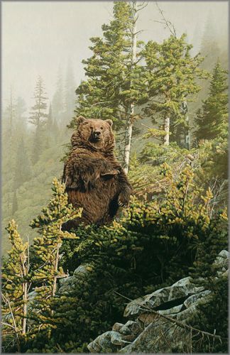 This was one of my first paintings of a grizzly, and it’s also one of my favorites. The setting is Glacier National Park, a haven for grizzlies in the lower 48 states because it’s over a million acres; since it was established in 1910 the wildlife were protected early on. There are an estimated 300 grizzlies in the Park. Grizzlies can be dangerous but despite their size and strength they are predominantly vegetarian and learn from their mothers where and when to look for succulent food. We interrupted this forager and I recommend we take a step back now … many steps back. - RF