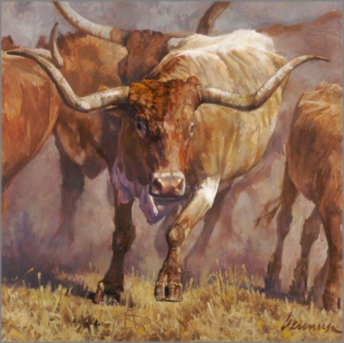 "Tex" is headed your way. As the landscape is filled with the sound of thundering hooves kicking up the dust, "Tex" leads the herd. This amazing longhorn almost leaps off the canvas.
