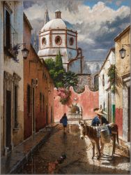 In the morning light, the lechero, or milkman, and his faithful burro make the rounds to deliver milk. On this lovely street, the man and his companion are up early to ensure everyone has their milk for the day. - GH