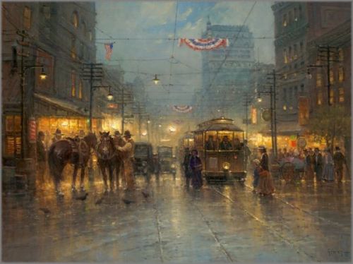 In turn-of-the century Dallas, cowboys and their horses shared the busy thoroughfares with trolleys and automobiles. In this release, dusk descends on the boulevard, and the welcoming amber glow of street lamps and the lights in shop windows beckon people to enjoy their evening.