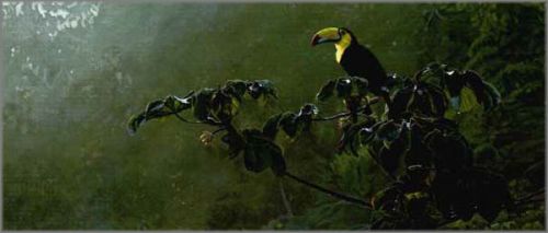 Paper. One of the ways to recharge my batteries as an artist is to take a trip. So, one spring, a friend and I planned a trip to Costa Rica and Guatemala. Spring in Central America offers great variety of wildlife and a fairly minimal amount of rain. The trip was fantastic. I viewed hundreds of species of plants and animals. I especially loved seeing and exploring ancient Mayan temples. Of the birds I viewed, the keel-billed toucan just begged to be painted. The colors in the bill were amazing. To show off the toucan and the cecropia, a jungle tree often visited by toucans and other birds, I chose a minimal background of jungle greens and Mayan mist. - T.I.