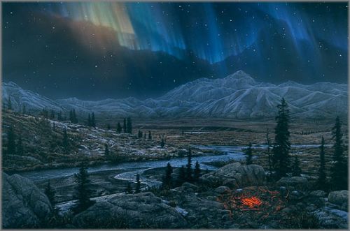 I enjoyed balancing and contrasting the warm embers of a dying campfire with the aurora borealis - the amazing phenomenon also known as the northern lights. It is one of those natural things that has captivated people all over the world for millennia. There are a lot of things that scientists have discovered about it, but I'm more interested in the emotional side because it is so beautifully ethereal. - SL
