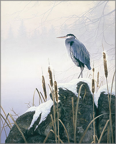 They will stand motionless in the water until a fish swims within range of their lightening-fast breaks. The Great Blue Heron is among the most elegant of the wading birds. Here the heron is shown in a snowy habitat. The birds will winter anywhere the water does not freeze over and where the fish are plentiful. - SL