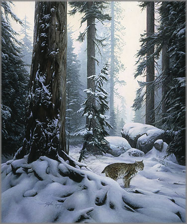 The first snow of winter has blanketed the forest floor beneath firs and pines. A young bobcat finds the tracks and trails of mice and squirrels easily - but their makers not so easily. Black tufts on his ears help the bobcat listen for the faint stirrings of prey in this silent, snowy season. - SL