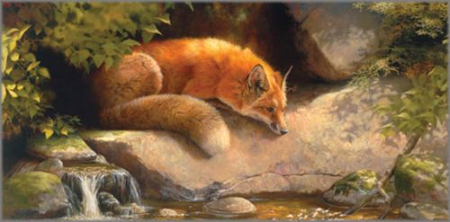 This red fox is a favorite subject of mine. I have painted him and his progeny on the creek behind my studio for many years. The fox's physical brilliance is matched only by the brilliance of his mind. He remains alert and analytical of his surroundings at all times. At this moment he sits, captivated by a dragonfly. Perhaps this is a moment of mutual enchantment. - BM