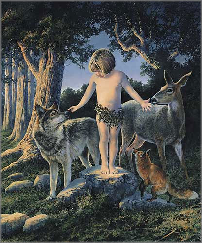 I believe that in all living things there is a common core of understanding - a precious thread that bonds us all together. As adults, we sometimes deny the existence of that understanding, falling prey to our own aggressions (represented here by the wolf), secrecy (the fox) or fear (the deer). Children, on the other hand, feel the strong tug of the tread at their hearts and respond with openness and trust to the world around them. - BM