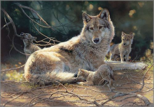 Wolf pups love to play. They will chase and wrestle with each other just as puppy dogs do. As is often the case in the wild, many of their games appear to be practice for the things they will do as adult wolves. When they are not wrestling with each other, any object becomes fair game for ‘the hunt’. Sticks, feathers, bones or even their mother’s tail is prey to be stalked and captured in the safety of their deep wood rendezvous site.