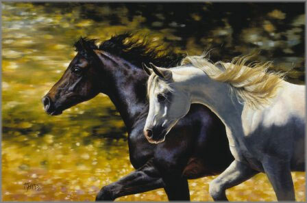 I absolutely love this image. The duality of nature combined with the strength and speed infuses this symbolic and poetic piece with an energy all its own. The spontaneity and excitement that comes from a horse is spectacular to watch. But it's always a challenge to give a painting a sense of movement. These geldings have such a rhythm that against the blurred lighting of the background, they appear to sail through the canvas. A blend of delicacy and masculinity, there's both harmony and play between the two, their enthusiasm and energy the brilliance bounce off one another. While the light plays off the black and white, you still can see every color of the rainbow. - BM