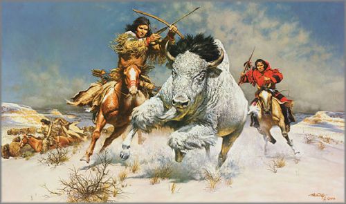 Plains Indian legend holds that the white buffalo was such a rarity that even the Great Spirit was in awe of it. The beast was valued by all the tribes, especially the Mandans for whom a good skin could command the price of ten to fifteen horses. Displayed in a place of special importance, the hide was considered Big Medicine. The chances of a white bison appearing in a herd are one in five million, so I feel lucky to have seen one under any circumstances – almost as lucky as the two Sioux hunters in Big Medicine must have felt. - FM