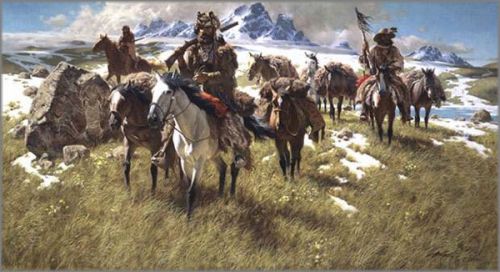These mountain men carry pelts, the results of a winter spent hunting and trapping in the Wind River Mountains of Wyoming. - FM