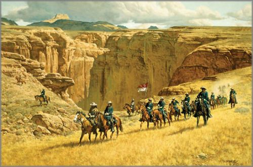 An army patrol scours the dry and dusty but spectacular canyon country in search of Indians, who refer to the cavalrymen as “Long Knives” for the sabers they carry. Though the men on these exhausting patrols rarely found Indians, they did learn the lay of the land and their geographic discoveries helped to create some of the first maps of the Southwest. - FM