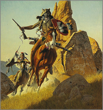 At some other time, these war-bent Comanches might pause to study the petroglyphs and speculate about those who passed this way before them, but today their attention is focused on a more urgent mission: defeat of a waiting enemy. The leader, in wolf headdress, has painted his face and body black for battle. - FM