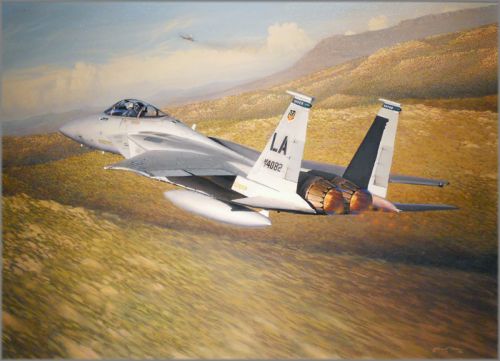 The pilot is going to have to be awfully good . . . the Eagle has the advantage and is a hard plane to shake. To impart a feeling of power and motion, the landscape is at a slight angle and the foreground is blurred as the Eagle roars by at about 500 knots. - WSP