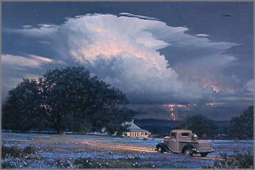 A solitary rancher in his old Ford pickup drives toward his home beneath the live oaks. In the sky flies a DC-3, heading away from a thunderstorm that is rumbling across the plains, the lightning adding white light to blue moon glow on a carpet of Texas Blue Bonnets.