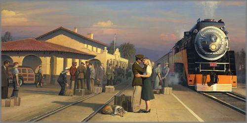 It is a warm winter day just after the bombing of Pearl Harbor in 1941. Our young Army Air Force Lieutenant stands out from the crowd as he bids his girl goodbye. Locomotive 4443 of the Noon Coast “Daylight” slowly eases to a stop at Santa Barbara Station. The next stop is San Luis Obispo, 119 miles up the line. With a ride time of two hours, a passenger might have time for dinner in the dining car — if he wanted to spend at least ninety cents or splurge on the fresh mountain trout at $1.50. In the air are two P-38 fighter aircraft on their first test flight, a mere day after rolling off the assembly line in Burbank. Full production of operational aircraft has begun and will continue around the clock. Young soldiers departing for war after Pearl Harbor faced the unknown road ahead with patriotic and passionate commitment and they held their heads high as they bid their loved ones farewell. - WP