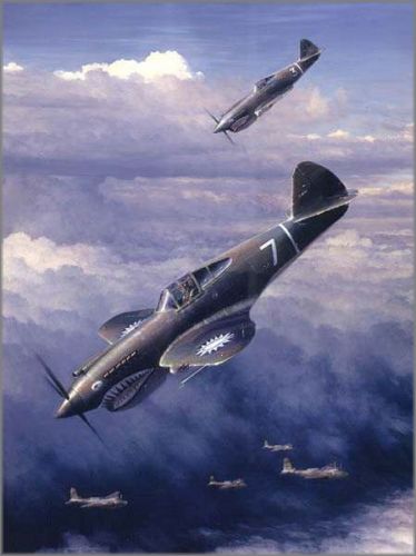 This scene depicts Bob Neale and his wingman W. E. Bartling during a diving attack on the Ki-21’s. Bob Neale accounted for one of the victories during this action and went on to become the AVG’s top scoring ace. – WP